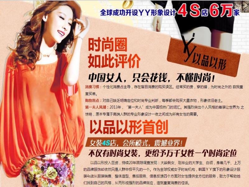 介紹:  韓版服裝在中國得到廣泛的暢銷之后,各種韓版服飾開始在中國市場不斷被推出。YY&以品以形,以韓版服飾為主流,同時兼顧歐美風格。YY&以品以形,專業服裝公司獨家打造,引發市場新風暴?! Y&以品以形,目前隸屬北京東華旺葉國際貿易有限公司。韓國YY&以品以形系全球女子時尚國際服務集團,集研發、設計、銷售、管理于一體。專業造就正規,專業成就經典?! 」踞槍喼夼韵M市場、韓國整體形象設計市場經濟發展趨勢、以及現階段韓國時尚美麗產業的競爭現狀,傾力打造專業服裝品牌—YY&以品以形形象設計服裝4S店?! ∫云芬孕巫鳛槿驒嗤訒r尚機構,擁有全球尖端技術及獨特的經營管理方式,涉及行業影視及文化傳媒、互聯網、企業營銷高端服務,涉及項目整形醫院、高端形象設計機構、形象設計服裝4S項目、化妝品、彩妝、飾品等,在國際及韓國榮獲諸多獎項,YY&以品以形形象設計服裝4S機構已遍布全球愈6萬家店!  2005年YY&以品以形在香港成立總部,服務于明星藝人及社會地位較高的女性。2011年10月YY&以品以形在北京成立亞洲區運營總部,將YY&以品以形市場化,在亞洲區運營YY&以品以形形象設計服裝4S店,把YY&以品以形服裝店從銷售,整體造型,售后服務,信息反饋“四位一體”深入人心的服務于更多女性朋友!