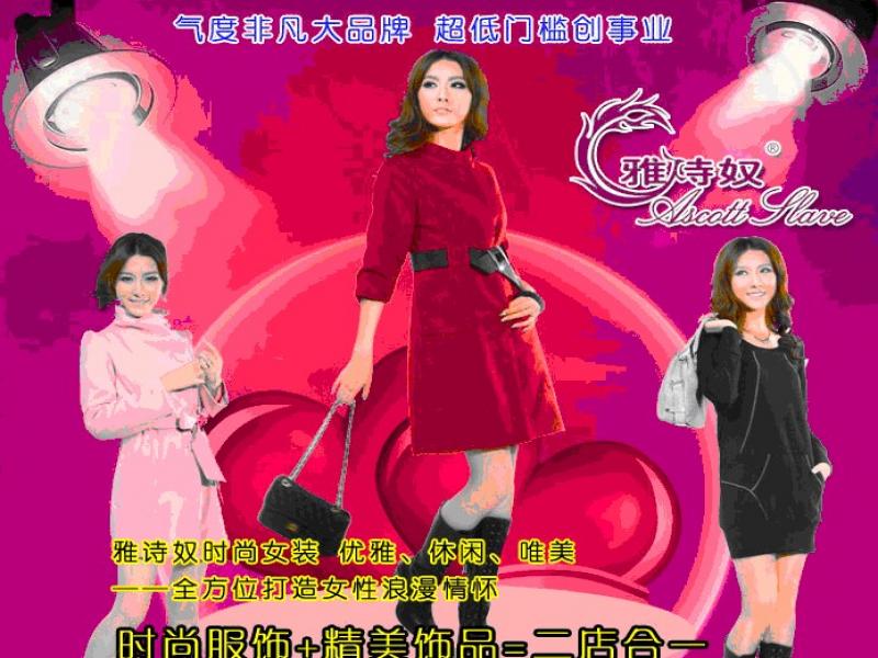 介紹:雅詩奴服飾有限公司乃集設計開發、OEM生產、銷售于一體的專業女裝服飾企業。公司自2005年創立以來,歷經4年的風雨磨礪,在激烈的市場競爭中脫穎而出,雅詩奴已經成為中國女裝服飾的知名品牌。回首過去,雅詩奴經歷了傳奇般的跨越式發展,一年一小變,三年一大變。公司專營時尚女裝服飾,包括潮流女裝、配飾及包包。公司擁有優秀的設計師團隊、先進的管理模式以及專業的營銷隊伍,在追求產品種類多元化、單一品種精致化的同時,公司采用多樣化的經營方式,主要分為專賣經銷商以及品牌代理商。