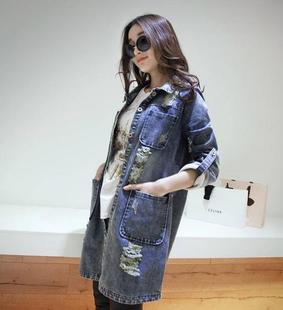 2014 春裝新款牛仔外套 女 中長款 韓版寬松破洞牛仔衣 潮 /