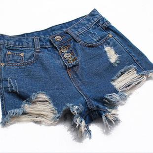 潮款高腰流蘇超短排扣磨破毛邊須破洞牛仔短褲 熱褲 歐美風女裝 /