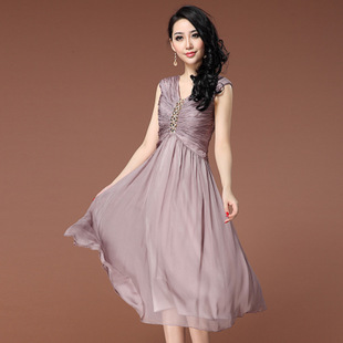 新款歐美原單禮服長裙 修身中長款V領真絲連衣裙晚裝禮服批發 /