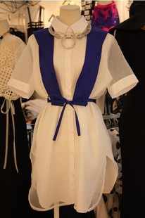 韓國東大門代購2014春夏新款歐根紗拼接襯衫短袖連衣裙女裝 /