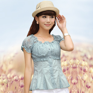 RALOS女裝鏤空蕾絲拼接襯衫圓領短袖小清新襯衣女裝大碼娃娃衫女 /