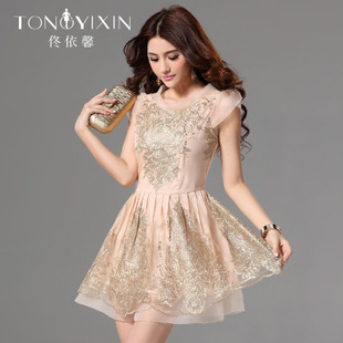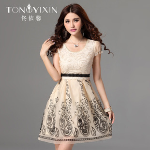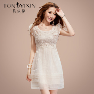 佟依馨高檔甜美女裝 2014蕾絲刺繡短袖連衣裙 韓版高端品牌連衣裙 /