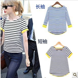 夏季新款大碼修身打底衫服裝 百搭圓領海軍條紋女T恤 衣服上衣女 /