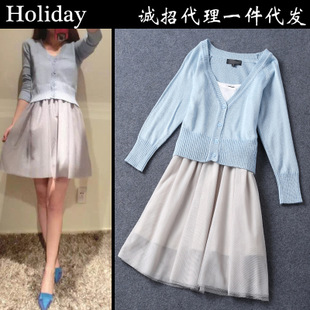 歐洲站2014秋冬新款女裝 天藍色針織衫+吊帶連衣裙套裝 女裝 /