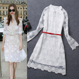 歐洲站2014秋冬新款女裝白網布繡花立領長袖連衣裙送腰帶一件代發 /