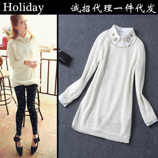 歐洲站2014秋冬新款女裝kaki同款釘珠重工長款毛衣加襯衫兩件套 /