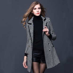 歐美時尚千鳥格毛呢外套一件代發歐洲站中長款雙排扣大衣女裝 /
