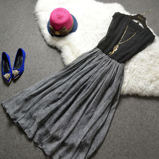缺貨下架 2014夏季新款 明星同款 拼色收腰真絲長(zhǎng)裙連衣裙 T1751 /