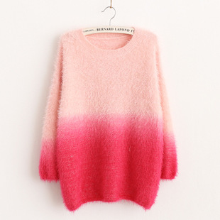馬海毛毛衣 韓版漸變雙色漸變圓領長袖 女式套頭長袖毛衣批發 /