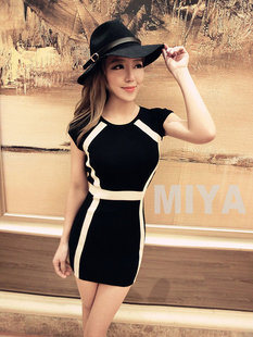 現貨 歐美小香風性感圓領黑白拼色收腰包臀針織彈力短袖連衣裙 /