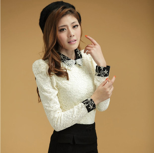 2014秋冬新款女裝加絨加厚蕾絲打底衫娃娃領上衣女長袖蕾絲衫包郵 /