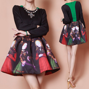 2014秋季新款歐美大牌女裝 印花修身收腰奢華水鉆長(zhǎng)袖蓬蓬連衣裙 /