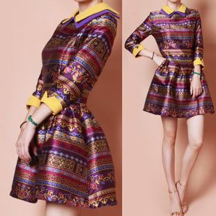 2014秋裝新款歐洲站女裝 羅馬復(fù)古大牌修身翻領(lǐng)九分袖蓬蓬連衣裙 /
