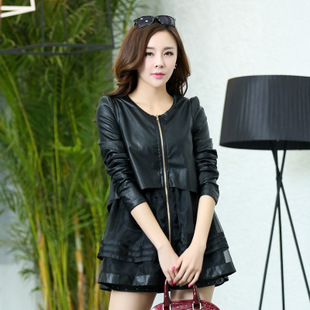 爆款秋裝女裝風衣 韓版荷葉邊網紗拼接PU皮外套風衣 純色衣戀9907 /