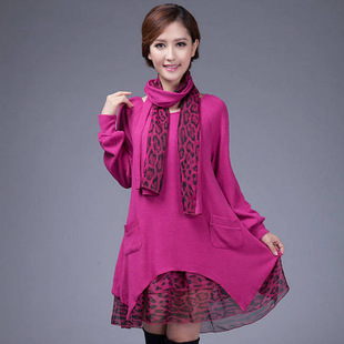2014秋冬長袖熱銷連衣裙韓版寬松豹紋拼接假二件針織連衣裙送圍巾 /