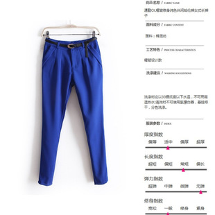 簡介:建議零售價 105.00 貨源類別 現貨 是否庫存 是 庫存類型 整單 產地 廣州 品牌 自主品牌 貨號 185 面料 棉類混紡 面料成分 60% 風格 韓版 款式 鉛筆褲/小腳褲 褲型 緊身型 褲長 九分褲 腰型 中腰 是否有腰帶 有腰帶 厚薄 普通 主圖來源 其他來源 上市年份/季節 2014秋季 顏色 白色,綠色,黑色 尺碼 S,M,L,XL 適合季節 秋季