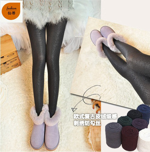 仙蒂 歐式復古皮絨緞感刺繡提花連褲襪 防勾絲美腿瘦腿春秋女襪子 /