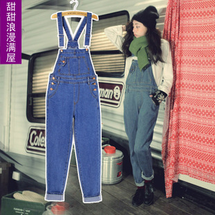 2014新款女裝A2589休閑百搭寬松工裝藍色牛仔背帶褲子寬松牛仔褲 /