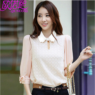 2014氣質春夏新款韓版娃娃領粉色蝴蝶結雪紡襯衫 女裝上衣雪紡衫 /