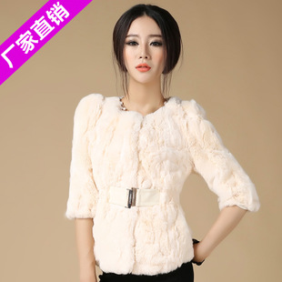 蘭詩嘉2014韓版女獺兔毛外套時尚短款七分袖皮草外套送綿羊皮腰帶 /