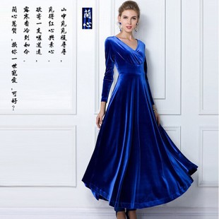 歐美外貿爆款秋冬大碼女裝長袖V領長款大擺拖地長裙金絲絨連衣裙 /