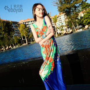 2015新款女裝 民族風連衣裙 雙V領印花冰絲沙灘裙 度假裙一件代發 /