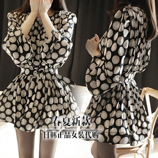 2015年春夏新款女裝 韓版收腰蓬蓬袖個(gè)性大圓點(diǎn)雪紡圓領(lǐng)連衣裙 /