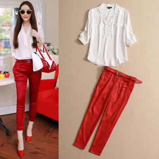 2014菁菁明星同款 歐美襯衫+紅褲夏季清新氣質 小香風名媛套裝S01 /