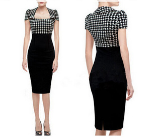 2014新款瑞麗 熱賣歐美爆款拼色千鳥(niǎo)格連衣裙優(yōu)雅大氣禮服裙 /
