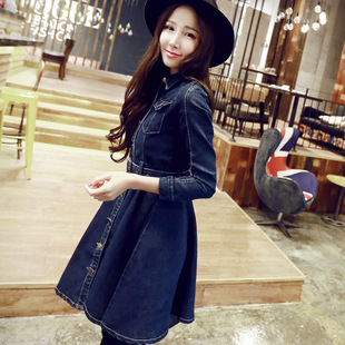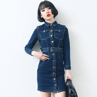 2015春夏新款歐美風翻領單排扣襯衫長袖牛仔連衣裙外套女配腰帶 /