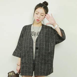 2015春款韓國東大門潮范寬松蝙蝠中袖格子西裝女式亞麻西服外套 /