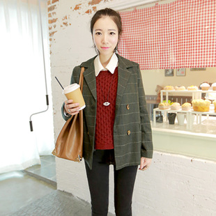 日單2015春裝新款復古文藝范格子毛呢西服 呢料西裝外套女 代發 /