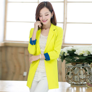 簡介: 建議零售價 ¥468.00 貨號 906# 產地 東莞 品牌 自主品牌 主圖來源 實拍有模特 貨源類別 現貨 是否庫存 是 庫存類型 整單 風格 韓版 圖案 純色 面料 棉類混紡 版型 修身型 衣長 中長款(65cm<衣長≤80cm) 領型 西裝領 衣門襟 一粒扣 袖長 長袖 袖型 常規袖 流行元素 撞色,熒光色,口袋 紐扣 工藝 拼貼/拼接 上市年份/季節 2014秋季 顏色 玫紅,亮黃 尺碼 S,M,L,XL 袖子款式 基本款 小西裝 小西裝 是否外貿 是