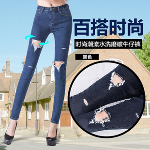 春秋款高腰不規則撕破感破洞顯瘦小腳鉛筆褲牛仔褲女 一件代發 /