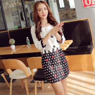 • 韓國(guó)東大門春裝新款女裝韓版修身印花顯瘦連衣裙七分袖蕾絲打底裙 /