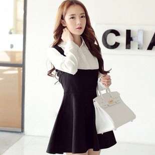 • 韓國(guó)東大門春裝女裝韓版修身荷葉邊撞色假兩件連衣裙襯衫打底裙 /