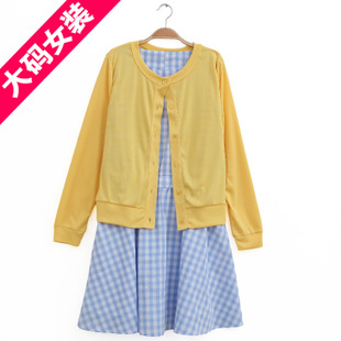 2015春夏新款胖mm大碼女裝韓版格子背心裙+針織開衫兩件套裝A1289 /