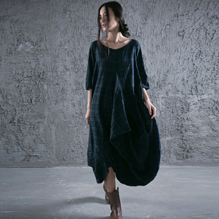 2014夏季新款 原創圓領中袖格子長裙 不規則連衣裙 /