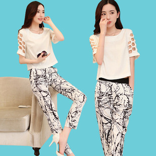 誠招女裝品牌代理 2015女裝鏤空袖上衣潑墨印花小腳褲休閑套裝 /