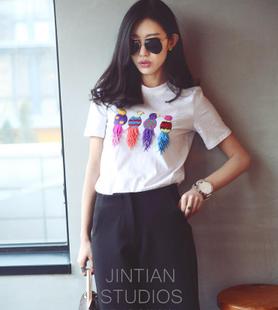 現(xiàn)貨陸續(xù)發(fā)2015年春夏新款歐美彩色釘珠小鳥亮片鸚鵡T恤短袖 /