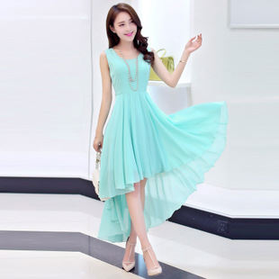 2015夏新品女士雪紡連衣裙夏 韓版修身燕尾不規(guī)則百褶 背心長(zhǎng)裙 /
