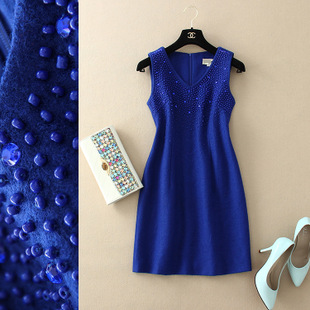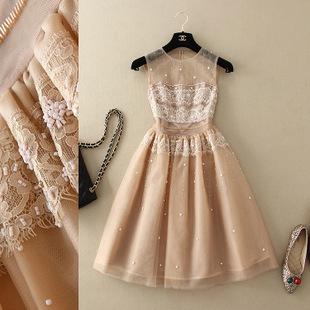 2015春夏新款手工釘珠蕾絲拼接網紗無袖連衣裙小禮服裙 /
