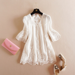 推薦!2015早春新款女裝 寬松鏤空繡花襯衣時尚 絲棉襯衫 /