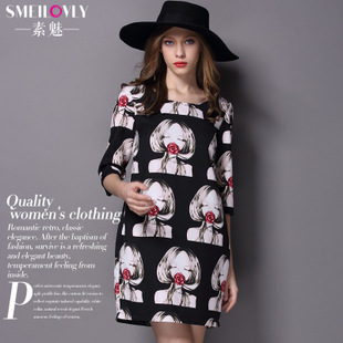 歐洲站 2015春新歐美胖MM大碼女裝人物印花高端中袖連衣裙 A2027 /