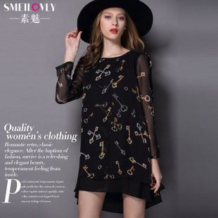 歐洲站 2015春季新款歐美印花長(zhǎng)袖高檔拼接雪紡大碼連衣裙 M2827 /