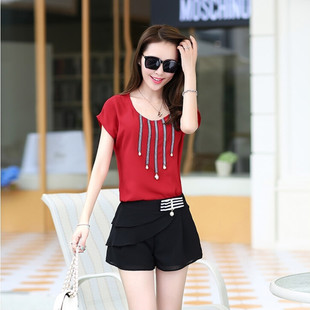 現貨2015夏裝新款時尚女式顯瘦兩件套短袖雪紡衫+短褲休閑套裝 /