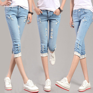 2015韓版蕾絲控彈力磨白磨破修身顯瘦淺色牛仔七分九分褲女 /