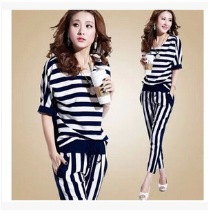2015夏裝新款女裝OL氣質(zhì)修身顯瘦時(shí)尚條紋雪紡兩件套大碼休閑套裝 /